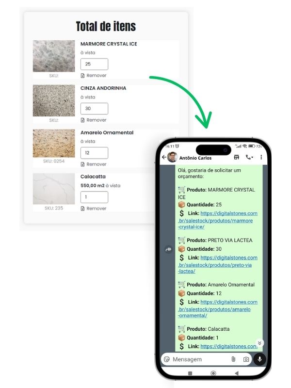 Automatize orçamentos, gerencie clientes e atualize seu estoque de mármore e granito pelo celular. Integre o Salestock ao seu site e venda mais pelo WhatsApp!